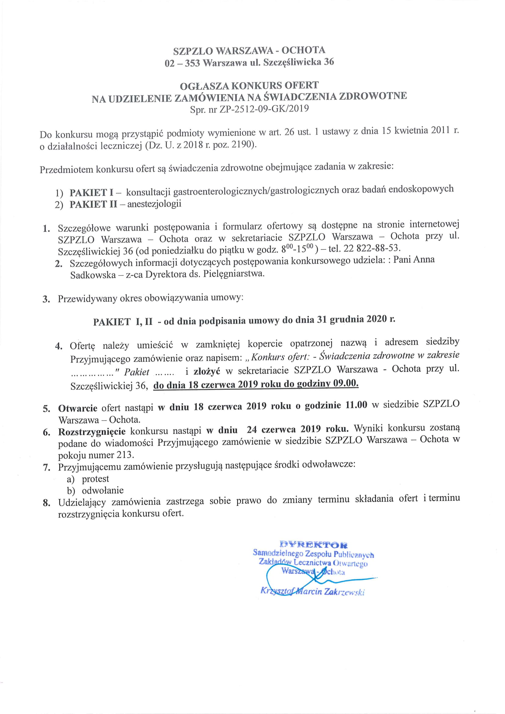 Konkurs na udzielenie zamówienia na realizację świadczeń zdrowotnych w zakresie konsultacji gastroenterologicznych/gastrologicznych oraz badań endoskopowych oraz świadczeń zdrowotnych w zakresie anestezjologii