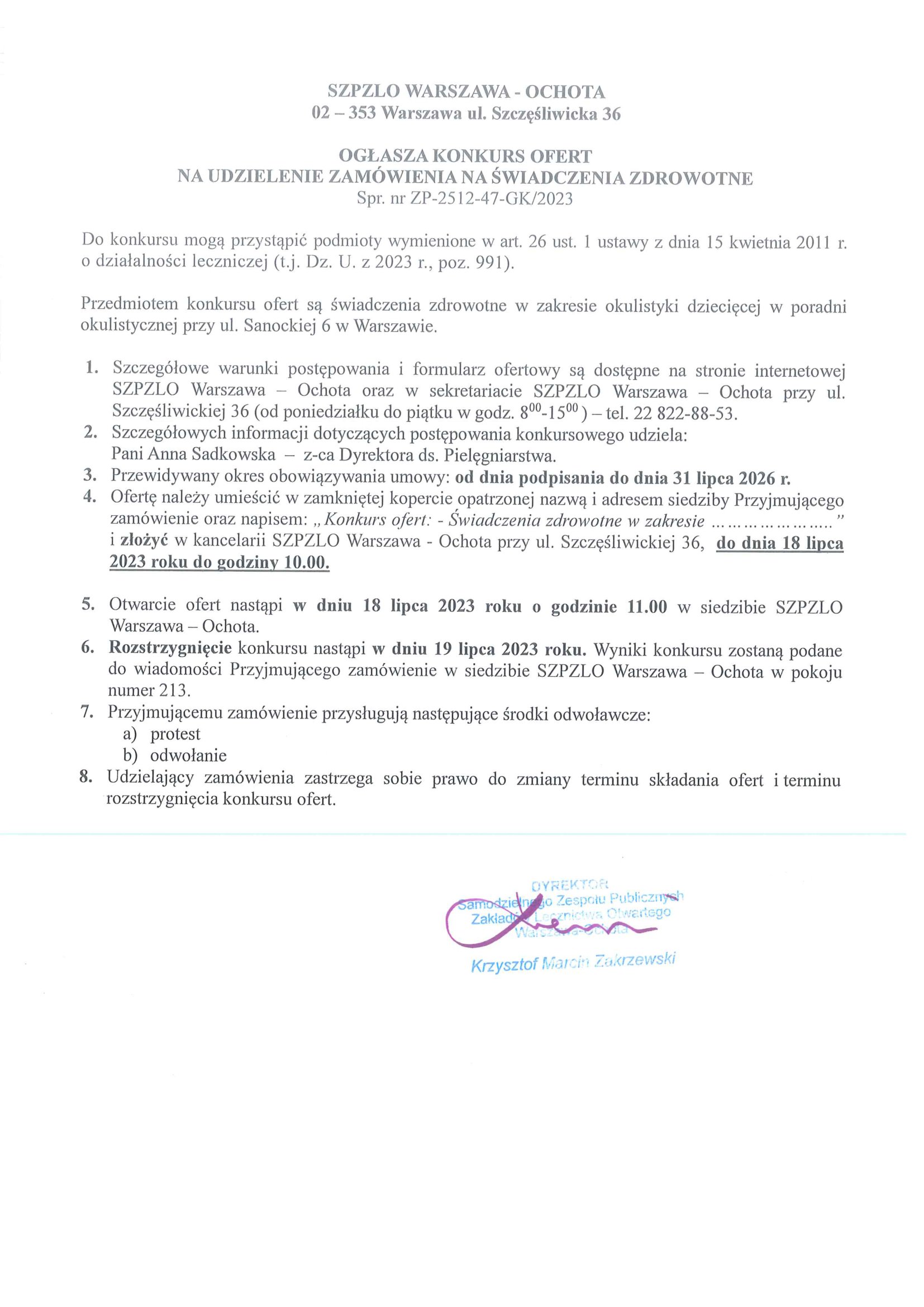 Konkurs na udzielenie zamówienia na realizację świadczeń zdrowotnych w zakresie okulistyki dziecięcej w poradni przy ul. Sanockiej 6 w Warszawie.