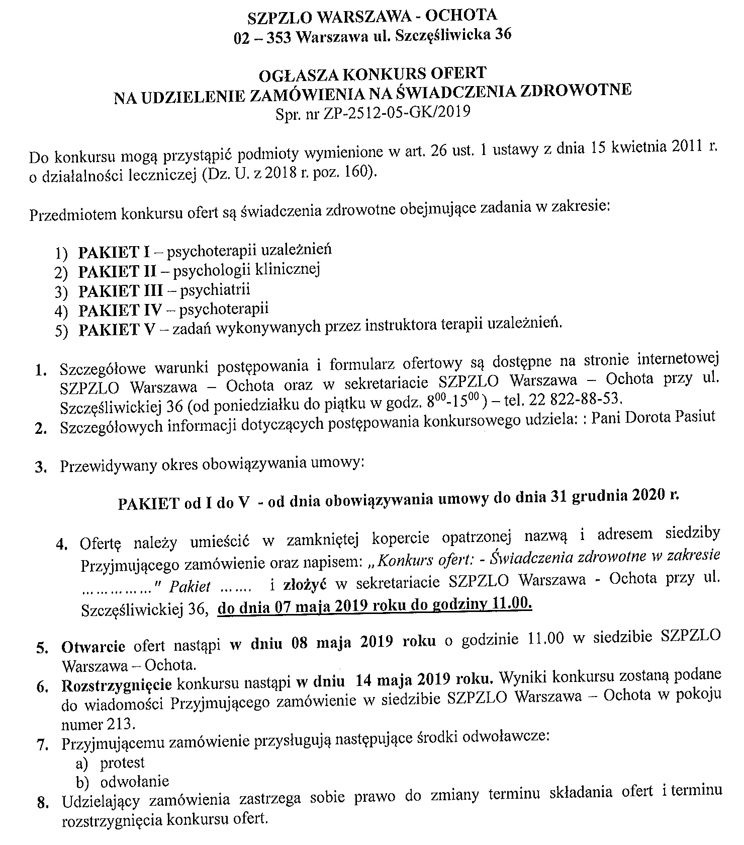 Konkurs na udzielenie zamówienia na realizację świadczeń zdrowotnych w zakresie psychoterapii uzależnień, psychologii klinicznej, psychiatrii, psychoterapii, zadań wykonywanych przez instruktora terapii uzależnień