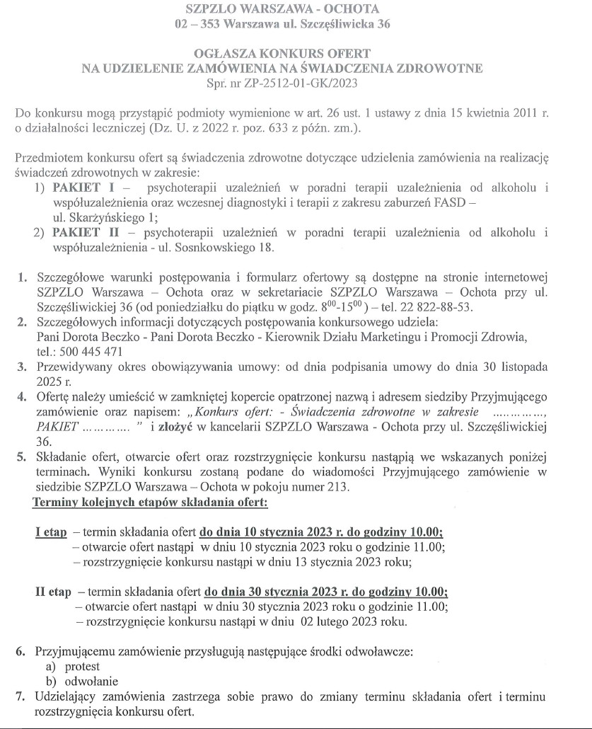 Konkurs na udzielenie zamówienia na realizację świadczeń zdrowotnych w zakresie psychoterapii uzależnień w poradni terapii uzależnienia od alkoholu i współuzależnienia oraz wczesnej diagnostyki i terapii z zakresu zaburzeń FASD, psychoterapii uzależnień w poradni terapii uzależnienia od alkoholu i współuzależnienia (2 etapy)