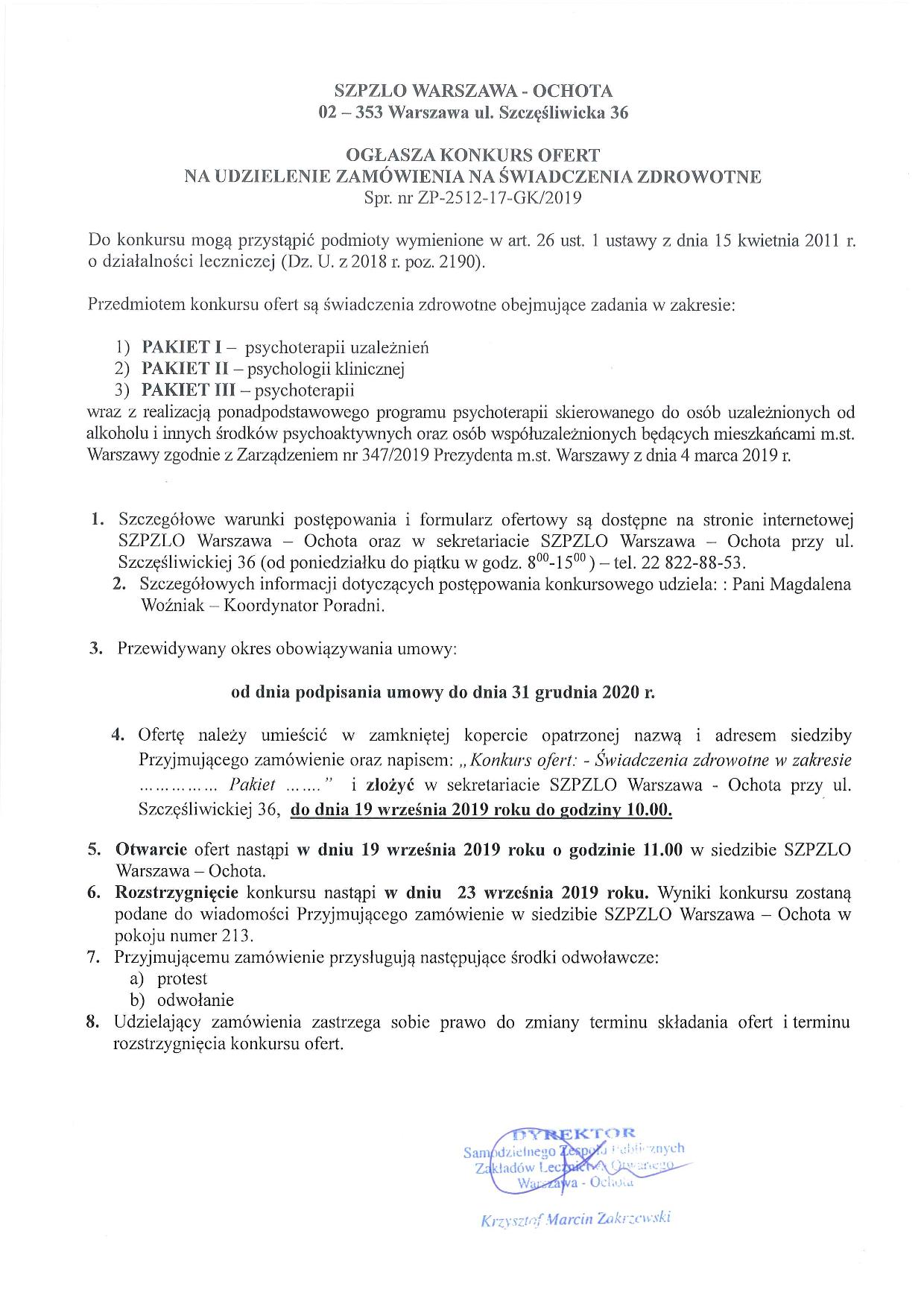 Konkurs na udzielenie zamówienia na realizację świadczeń zdrowotnych w zakresie specjalisty psychoterapii uzależnień, psychologii klinicznej, psychoterapii wraz z programem ponadpodstawowym psychoterapii