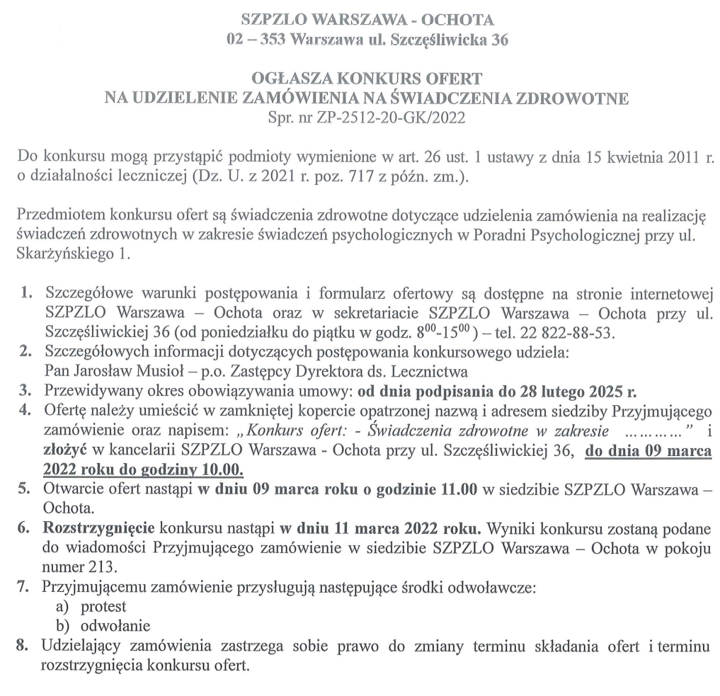 Konkurs na udzielenie zamówienia na realizację świadczeń zdrowotnych w zakresie świadczeń psychologicznych w Poradni Psychologicznej przy ul. Skarżyńskiego 1