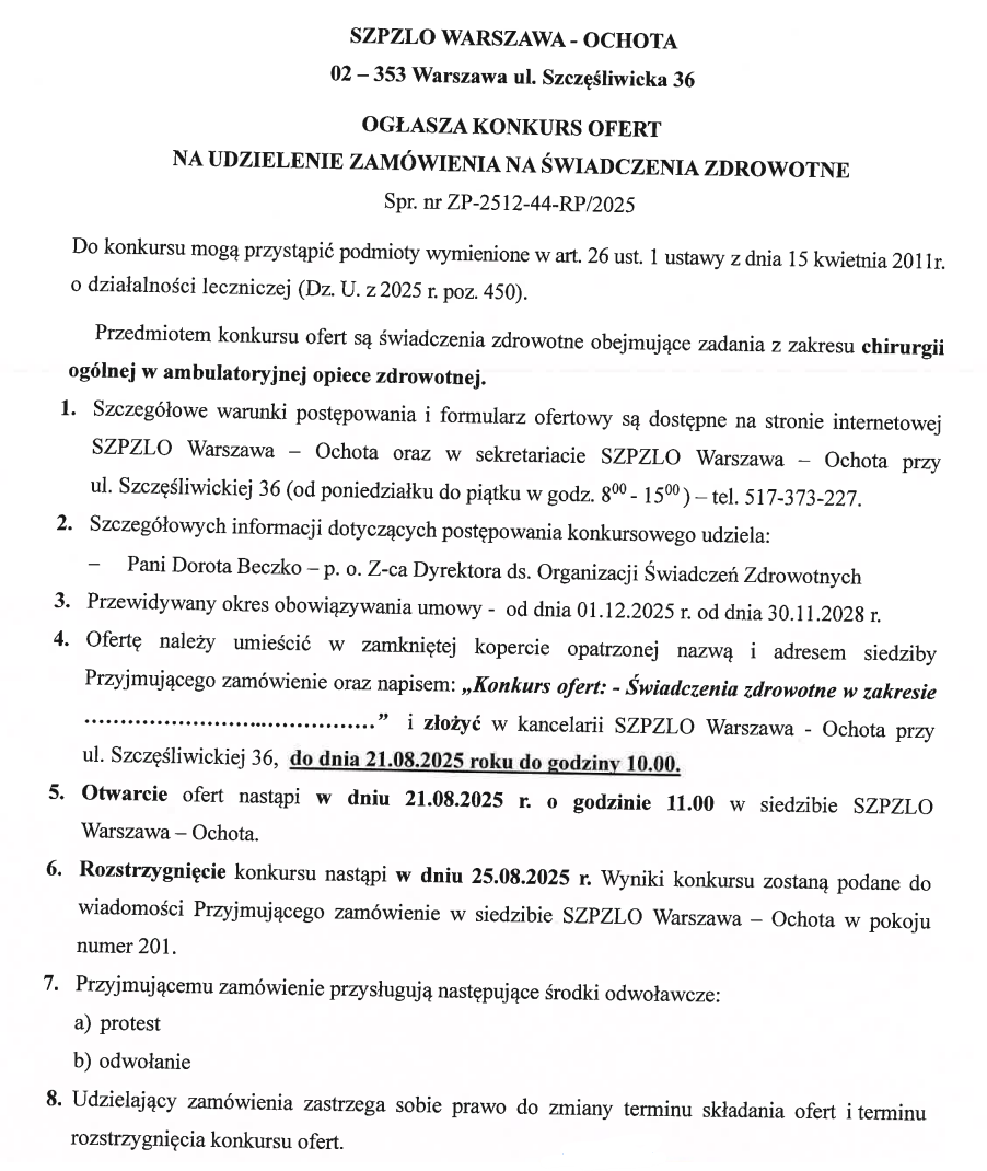 Konkurs ofert na świadczenia zdrowotne z zakresu chirurgii ogólnej w ambulatoryjnej opiece zdrowotnej ZP-2512-44-RP/2025