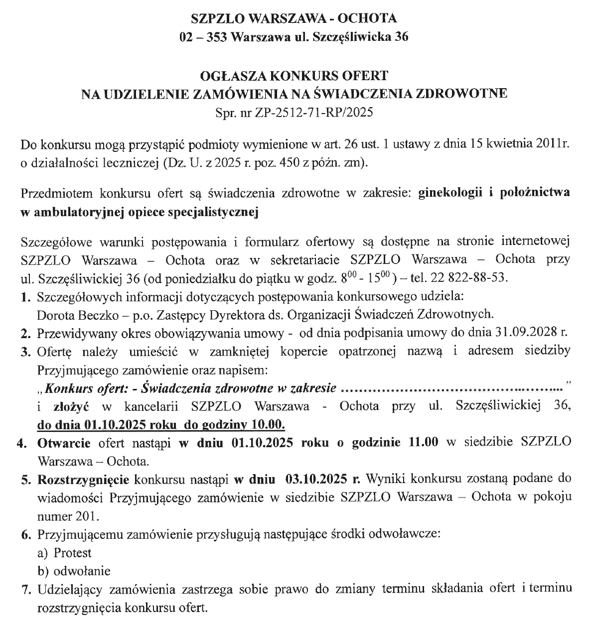 Konkurs ofert na świadczenia zdrowotne zakresie ginekologii i położnictwa w ambulatoryjnej opiece specjalistycznej ZP-2512-71-RP/2025