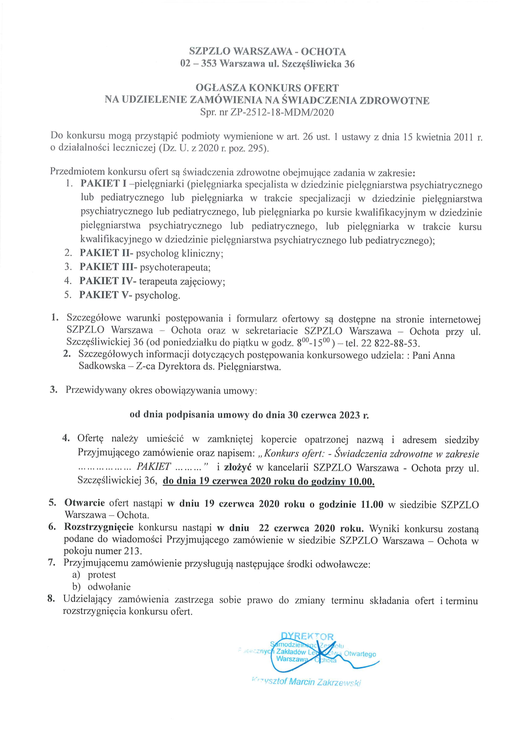 KONKURS OFERT NA UDZIELENIE ZAMÓWIENIA NA ŚWIADCZENIA ZDROWOTNE
