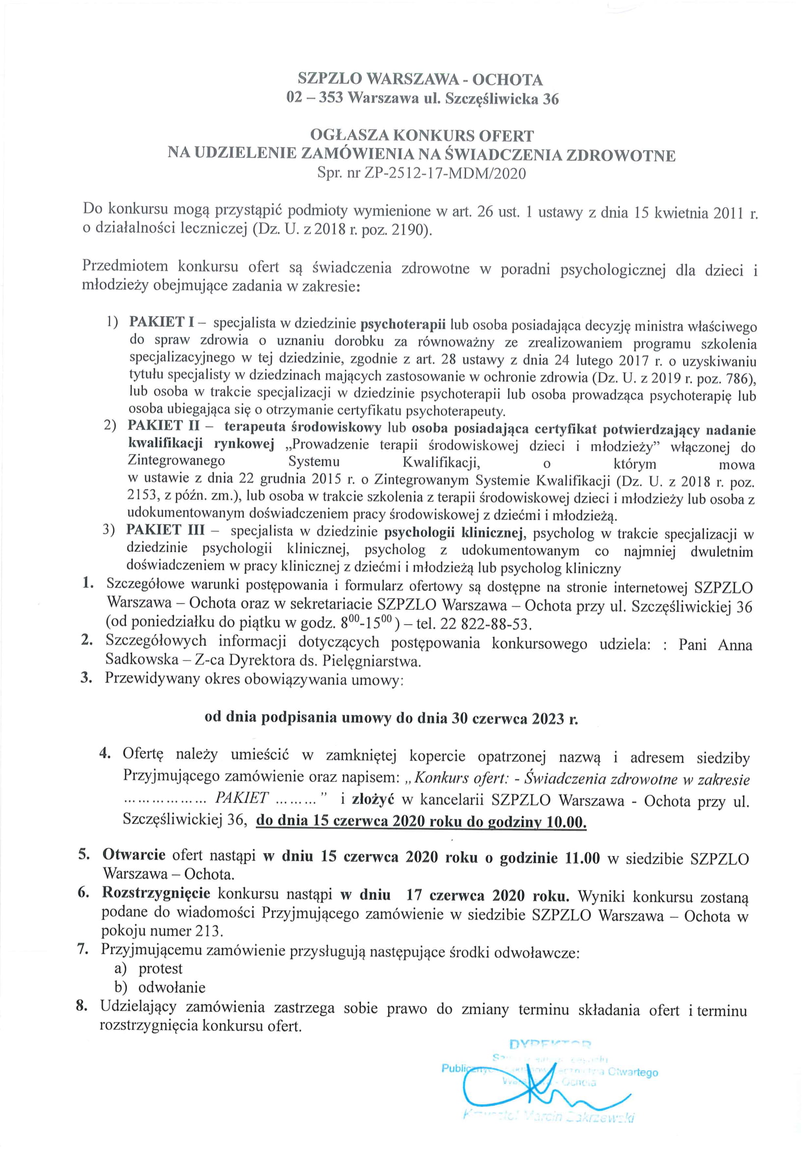 KONKURS OFERT NA UDZIELENIE ZAMÓWIENIA NA ŚWIADCZENIA ZDROWOTNE w poradni psychologicznej dla dzieci i młodzieży