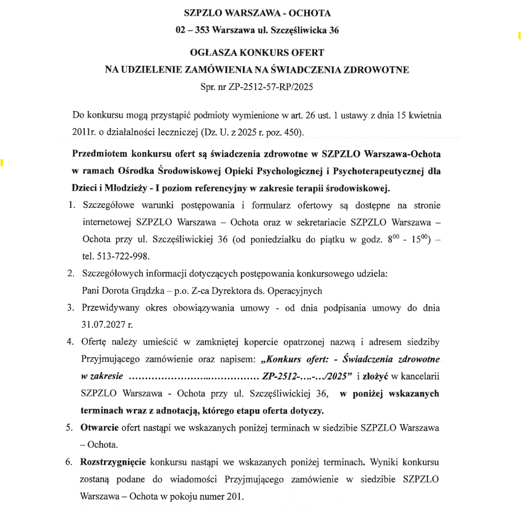 KONKURS OFERT NA UDZIELENIE ZAMÓWIENIA NA ŚWIADCZENIA ZDROWOTNE w ramach Ośrodka Środowiskowej Opieki Psychologicznej i Psychoterapeutycznej dla Dzieci i Młodzieży - I poziom referencyjny w zakresie terapii środowiskowej. (ZP-2512-57-RP/2025)