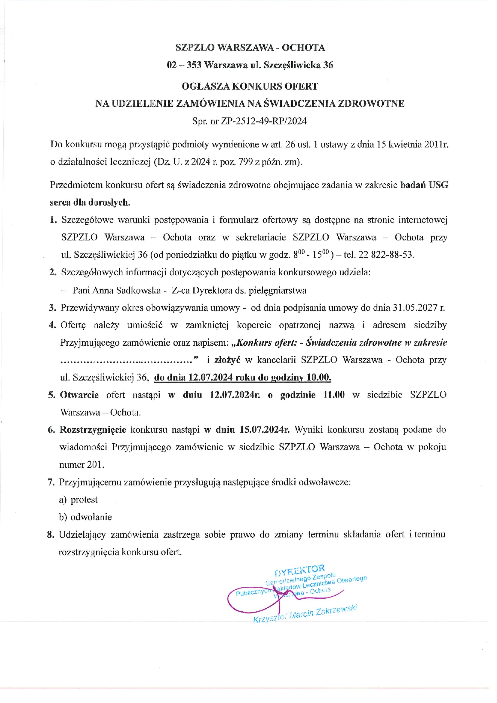 KONKURS OFERT NA UDZIELENIE ZAMÓWIENIA NA ŚWIADCZENIA ZDROWOTNE w zakresie: badań USG serca dla dorosłych (ZP-2512-49-RP/2024)