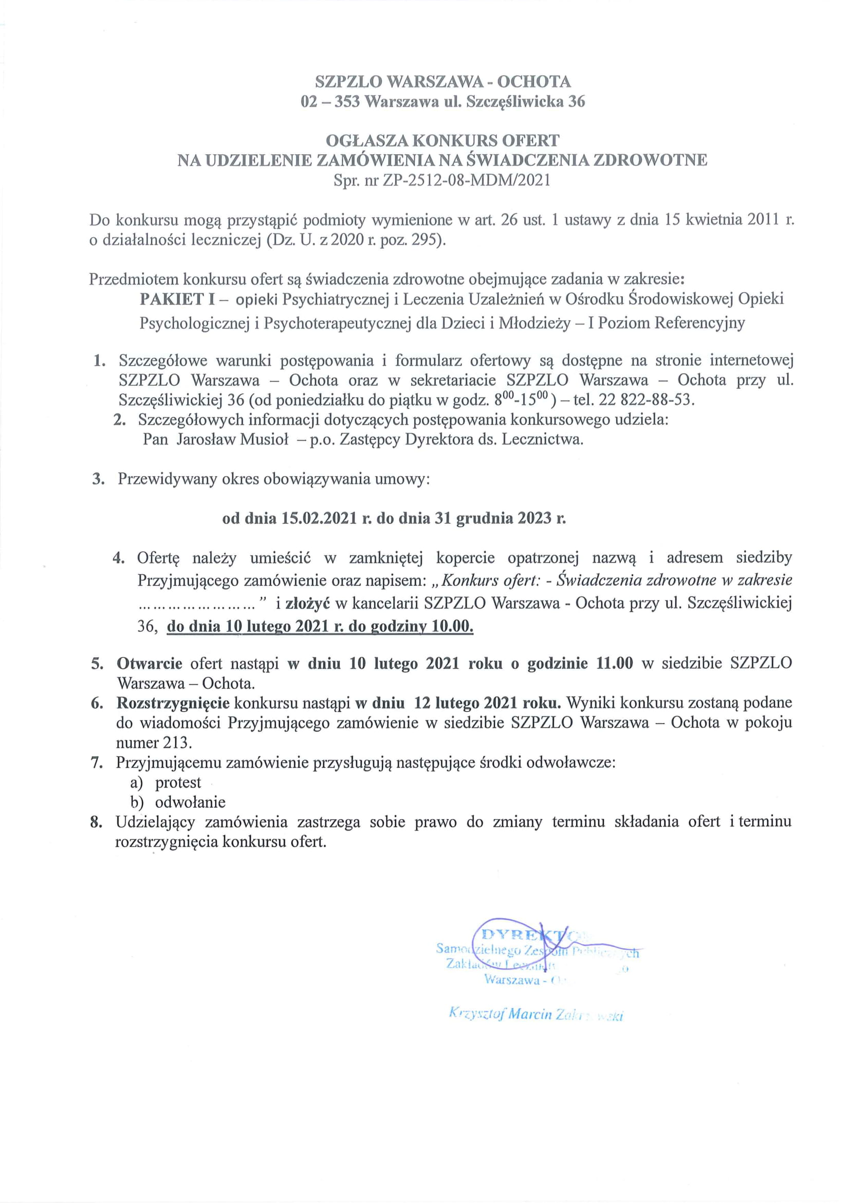KONKURS OFERT NA UDZIELENIE ZAMÓWIENIA NA ŚWIADCZENIA ZDROWOTNE w zakresie: opieki Psychiatrycznej i Leczenia Uzależnień