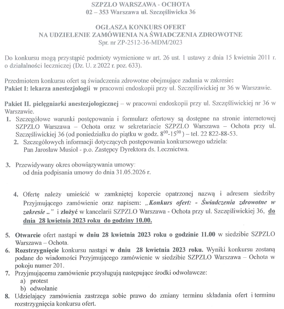 KONKURS OFERT NA UDZIELENIE ZAMÓWIENIA NA ŚWIADCZENIA ZDROWOTNE w zakresie: Pakiet I: lekarza anestezjologii w pracowni endoskopii. Pakiet II. pielęgniarki anestezjologicznej – w pracowni endoskopii
