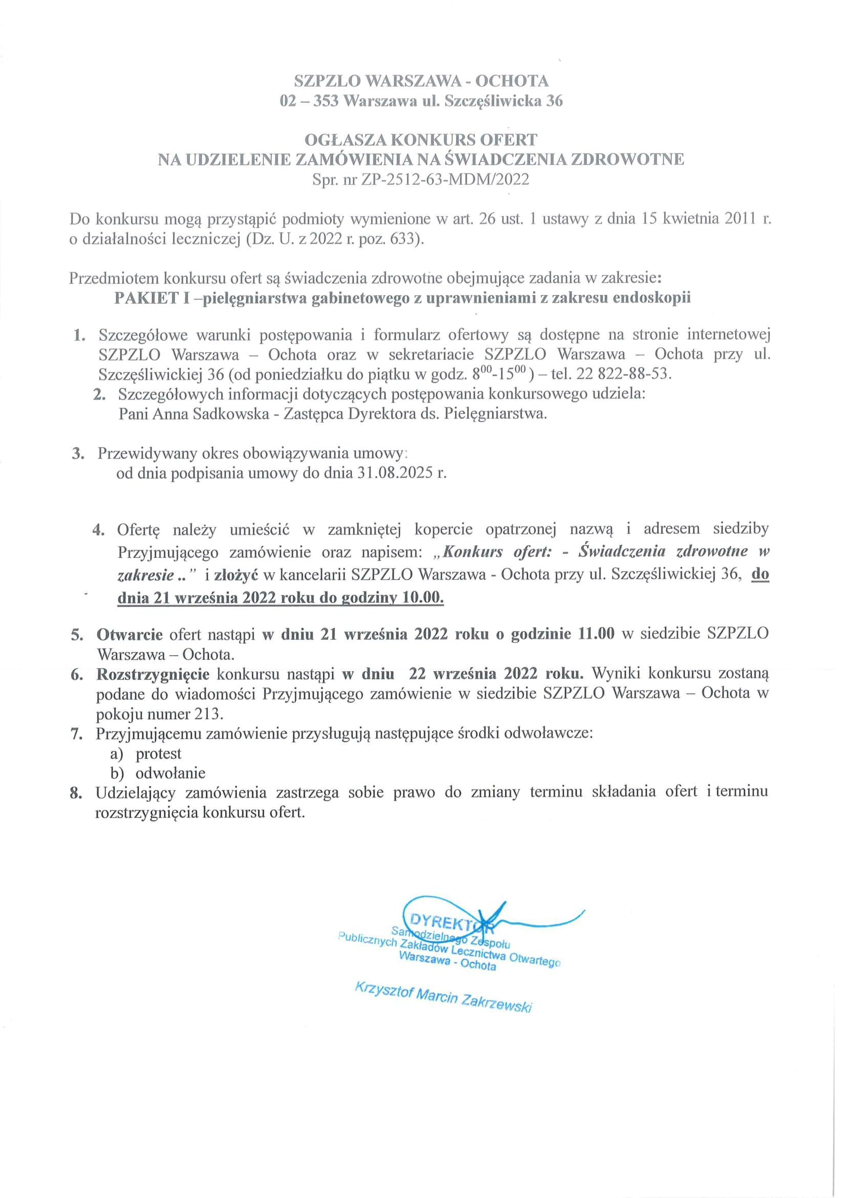 KONKURS OFERT NA UDZIELENIE ZAMÓWIENIA NA ŚWIADCZENIA ZDROWOTNE w zakresie: pielęgniarstwa gabinetowego z uprawnieniami z zakresu endoskopii