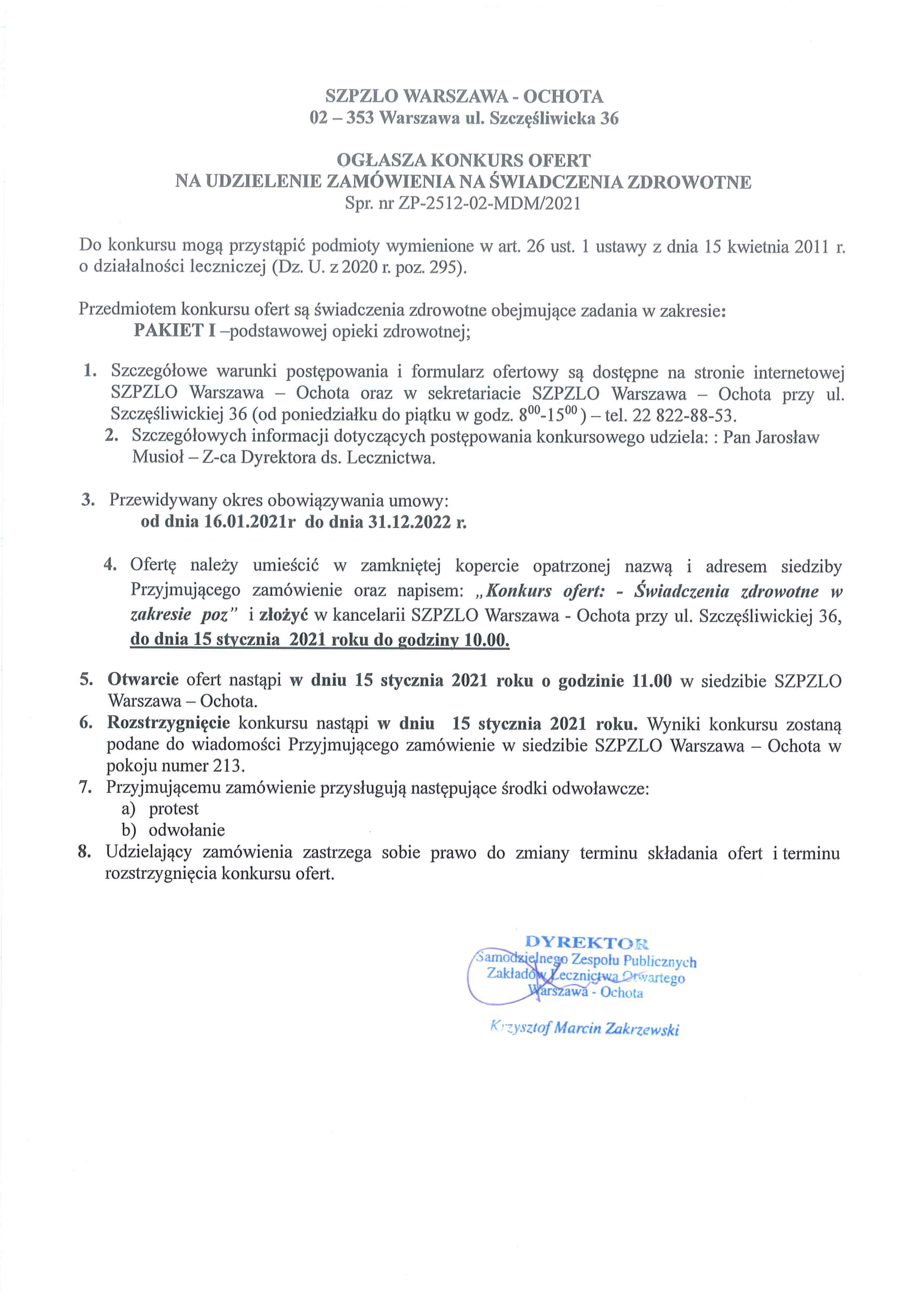 KONKURS OFERT NA UDZIELENIE ZAMÓWIENIA NA ŚWIADCZENIA ZDROWOTNE w zakresie: podstawowej opieki zdrowotnej