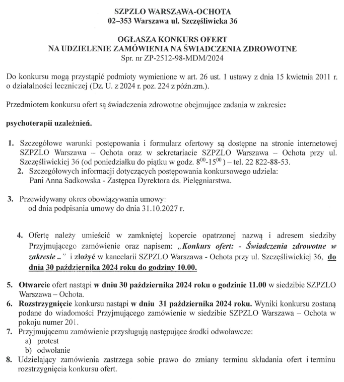 KONKURS OFERT NA UDZIELENIE ZAMÓWIENIA NA ŚWIADCZENIA ZDROWOTNE w zakresie: psychoterapii uzależnień (Nr ZP-2512-98-MDM/2024)