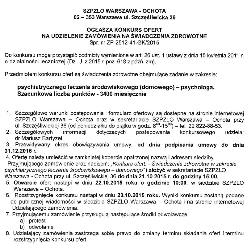 Ogłoszenie na świadczenia zdrowotne w zakresie psychiatrycznego leczenia środowiskowego (domowego) - psychologa. Nr sprawy ZP-2512-41-GK/2015