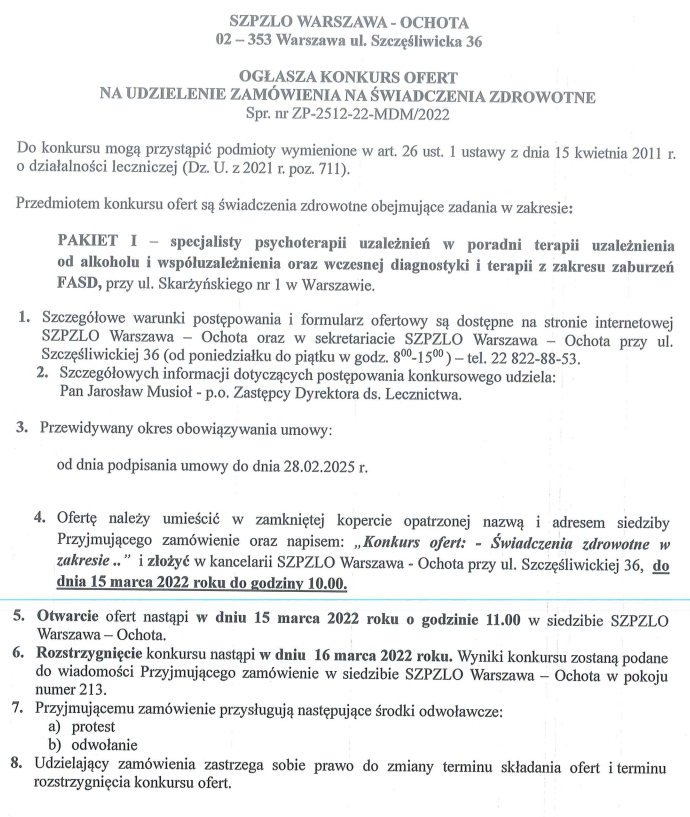PAKIET I specjalisty psychoterapii uzależnień w poradni terapii uzależnienia od alkoholu i współuzależnienia oraz wczesnej diagnostyki i terapii z zakresu zaburzeń FASD, przy ul. Skarżyńskiego nr 1 w Warszawie.