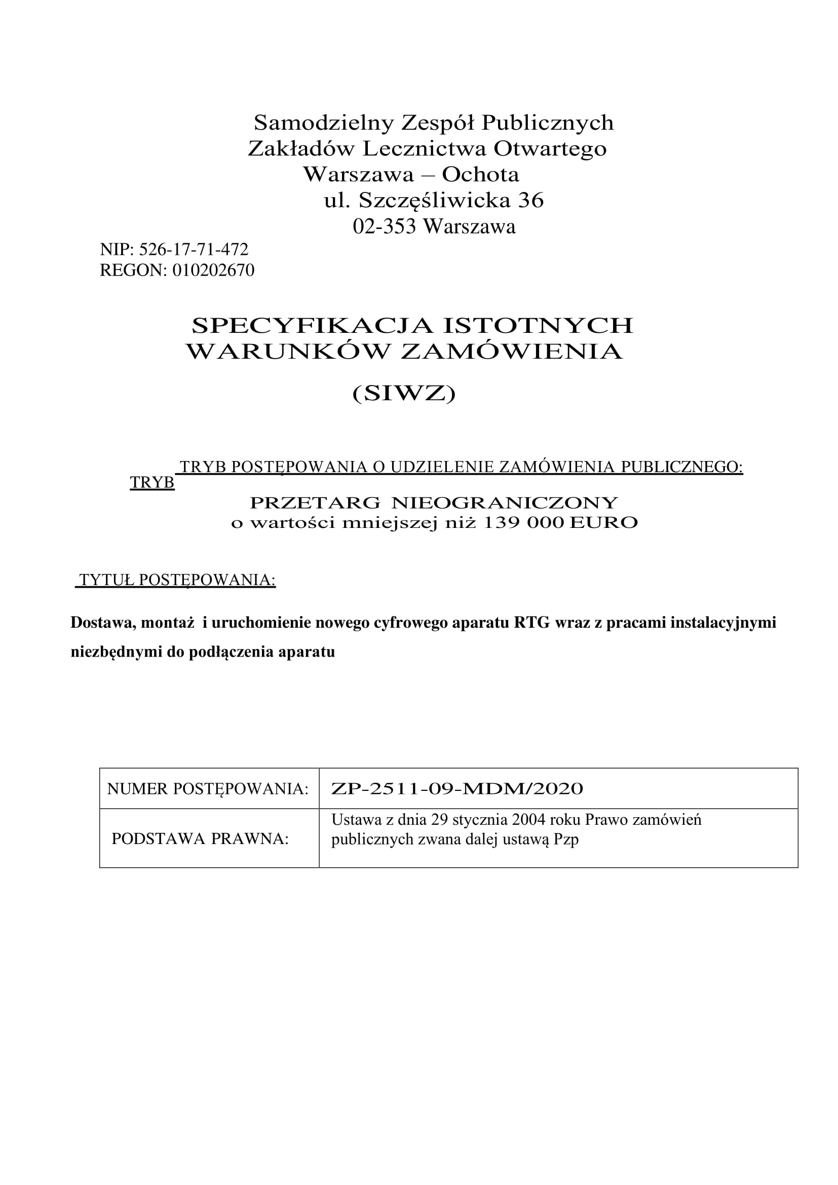 Zamawiający informuje iż w dniu 08.07.2020 r. o godz. 12:00 odbędzie się nieobowiązkowa, zalecana wizja lokalna na terenie SZPZLO Warszawa-Ochota przy ul. Szczęśliwickiej 36 (Pracownia Rentgenodiagnostyki – II piętro) .