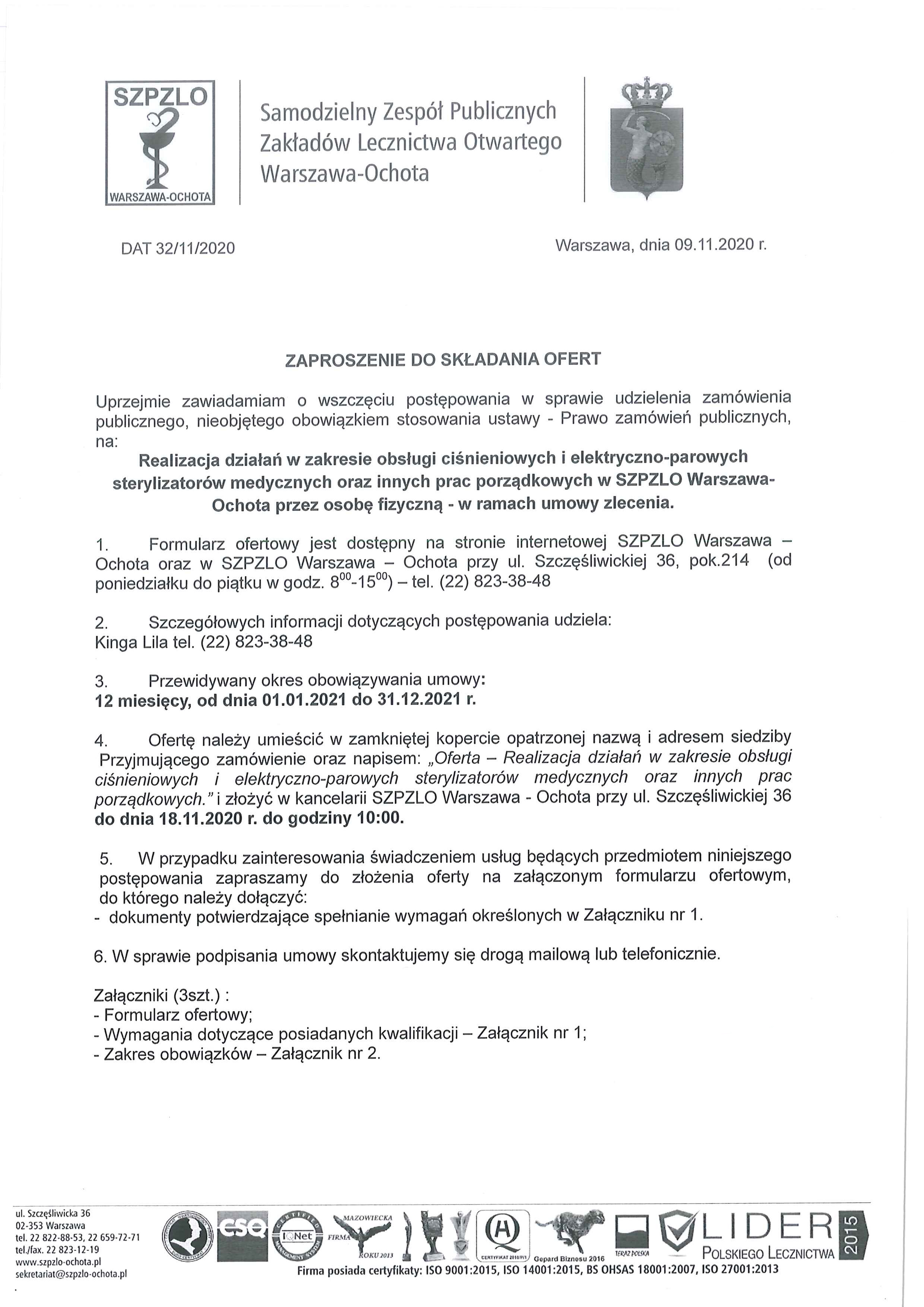 Realizacja działań w zakresie obsługi ciśnieniowych i elektryczno-parowych sterylizatorów medycznych oraz innych prac porządkowych w SZPZLO Warszawa Ochota przez osobę fizyczną - w ramach umowy zlecenia.