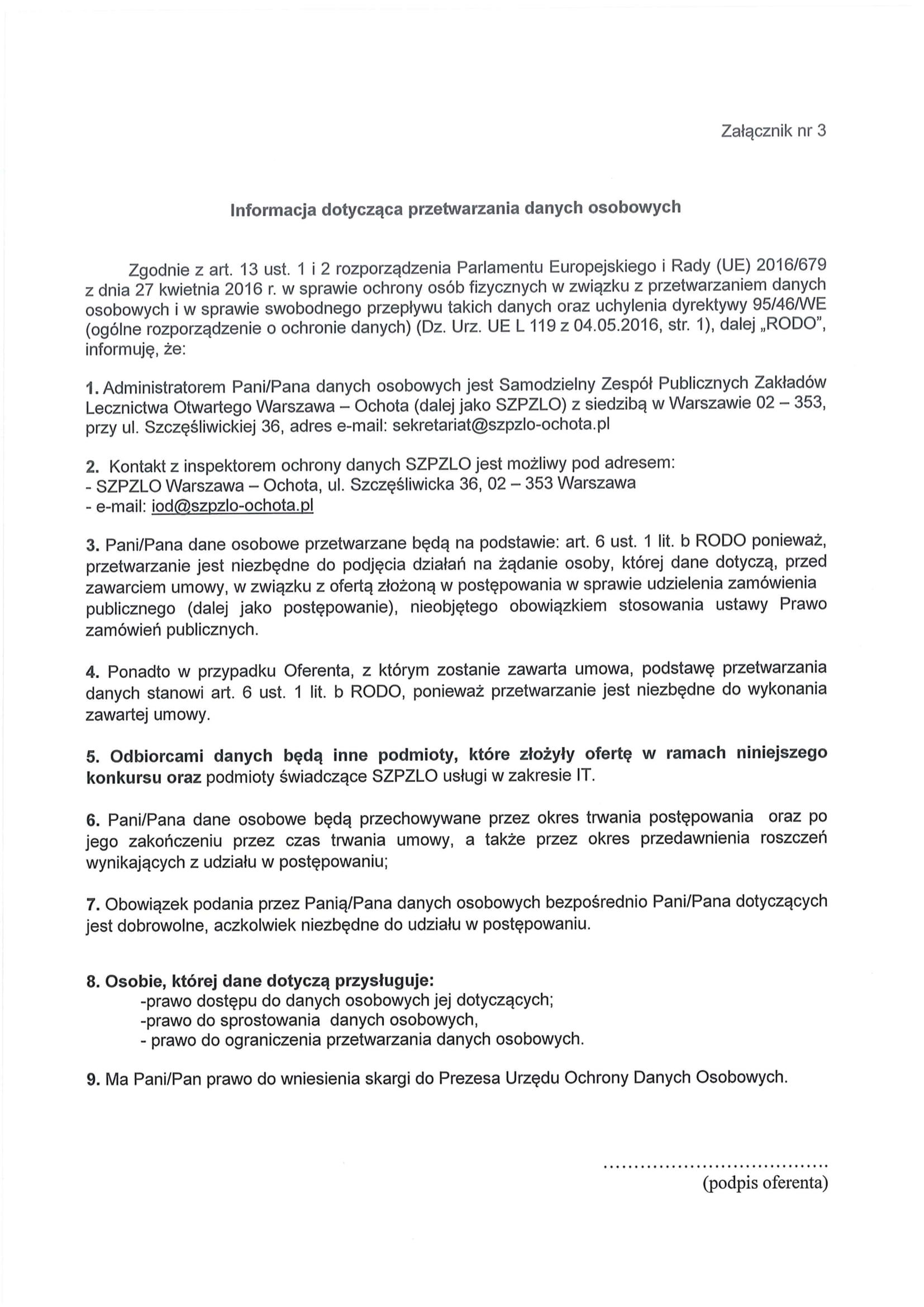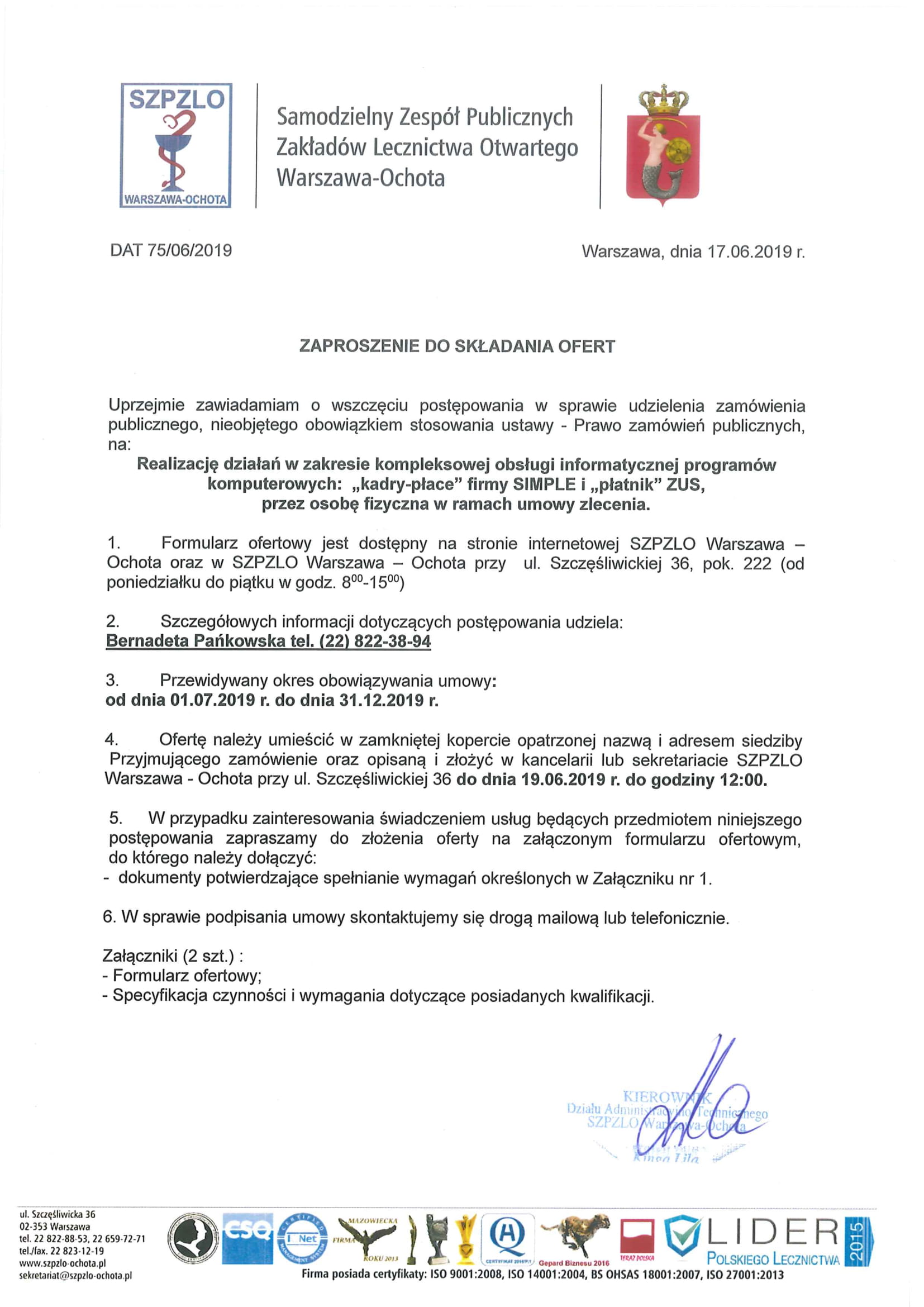 Realizację działań w zakresie kompleksowej obsługi informatycznej programów komputerowych: „kadry-płace” firmy SIMPLE i „płatnik” ZUS, przez osobę fizyczna w ramach umowy zlecenia.