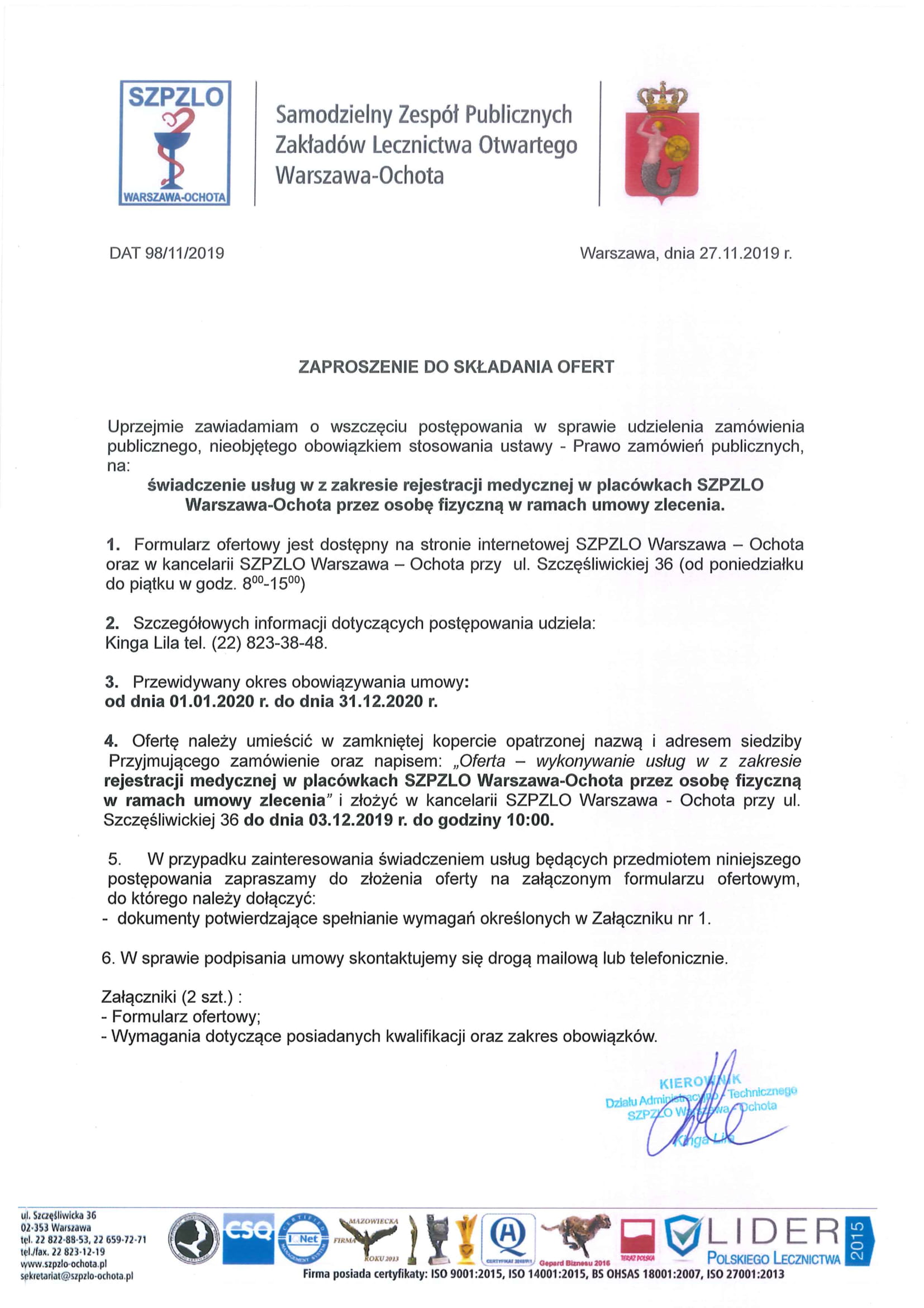 Świadczenie usług w z zakresie rejestracji medycznej w placówkach SZPZLO Warszawa-Ochota przez osobę fizyczną w ramach umowy zlecenia.