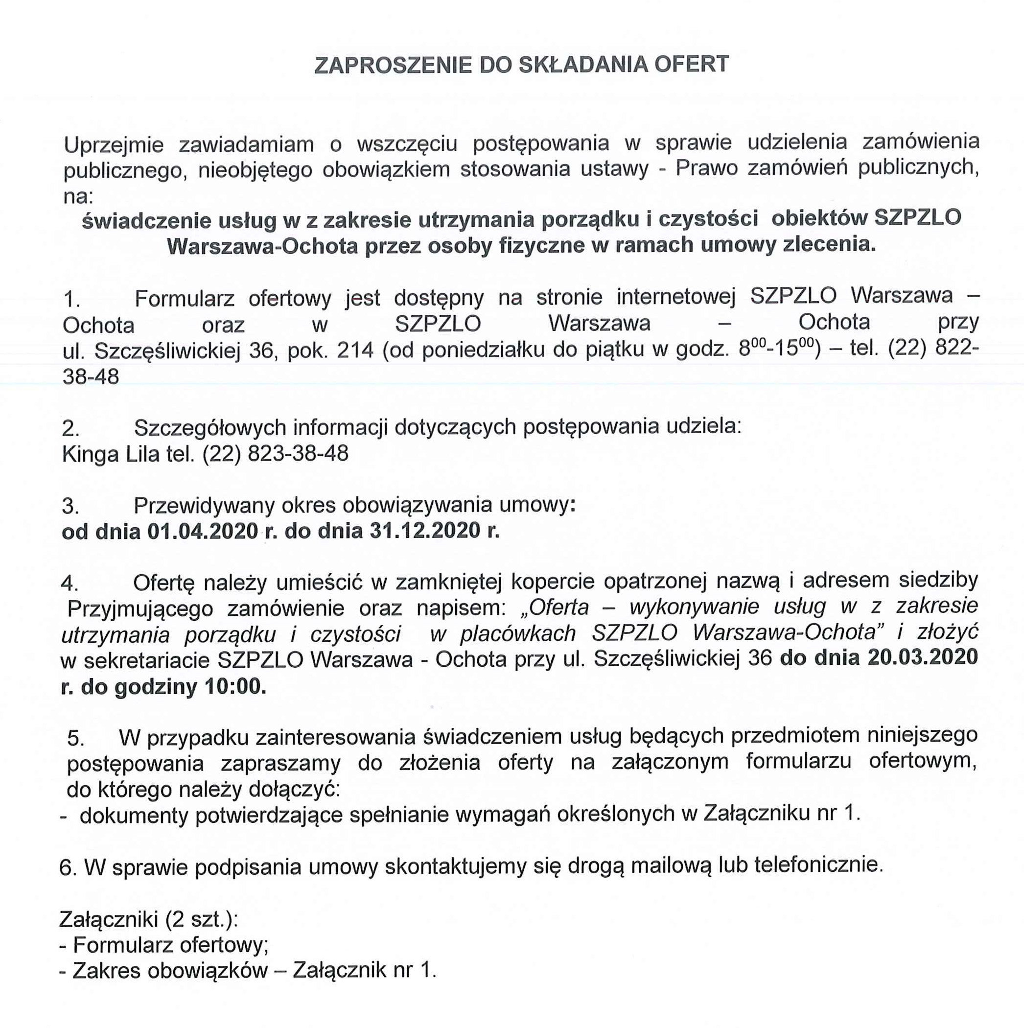 Świadczenie usług w zakresie utrzymania porządku i czystości obiektów SZPZLO Warszawa-Ochota przez osoby fizyczne w ramach umowy zlecenia.