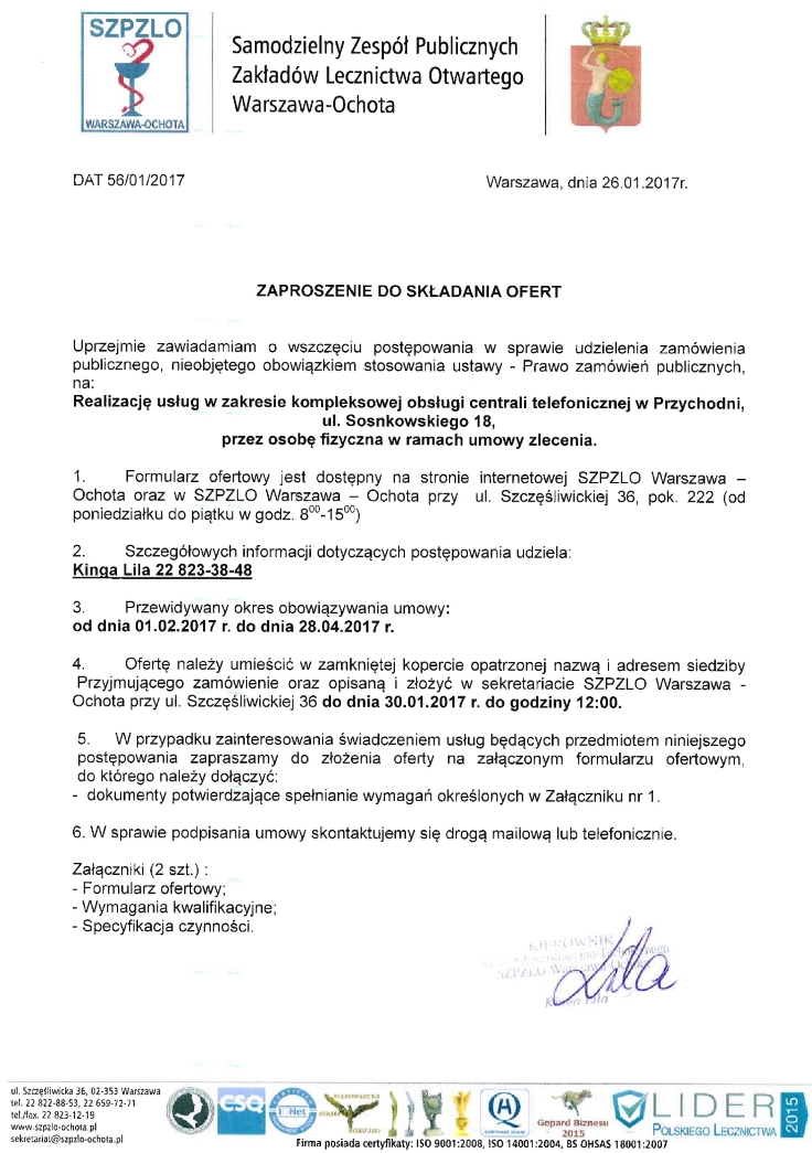 Zaproszenie do składania ofert na realizację usług w zakresie kompleksowej obsługi centrali telefonicznej – Przychodnia ul. Sosnkowskiego 18, przez osobę fizyczna w ramach umowy zlecenia
