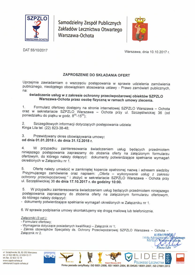 Zaproszenie do składania ofert na świadczenia usług w zakresie ochrony przeciwpożarowej obiektów SZPZLO Warszawa - Ochota przez osobę fizyczną w ramach umowy zlecenia