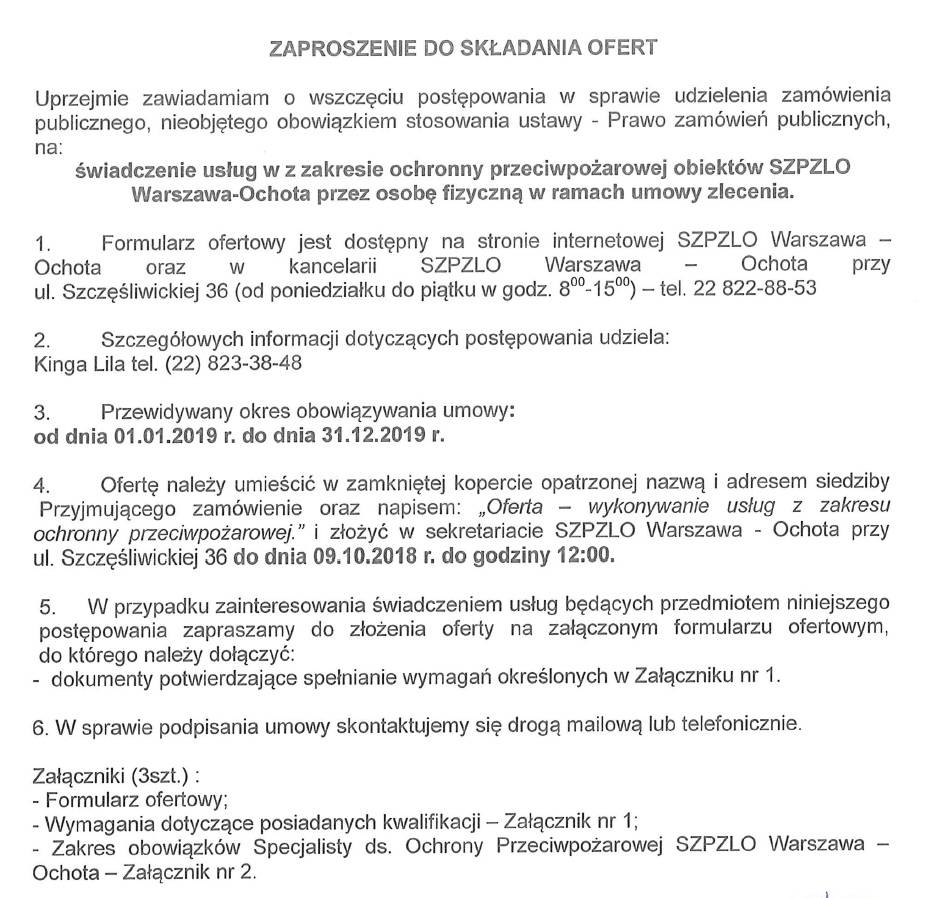 Świadczenie usług w z zakresie ochronny przeciwpożarowej obiektów SZPZLO Warszawa-Ochota przez osobę fizyczną w ramach umowy zlecenia