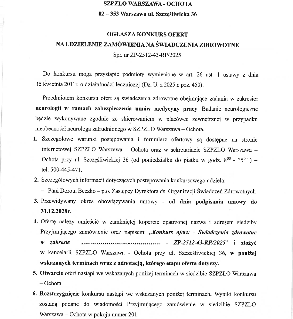 Konkurs ofert na świadczenia zdrowotne w zakresie: neurologii w ramach zabezpieczenia umów medycyny pracy ZP-2512-43-RP/2025