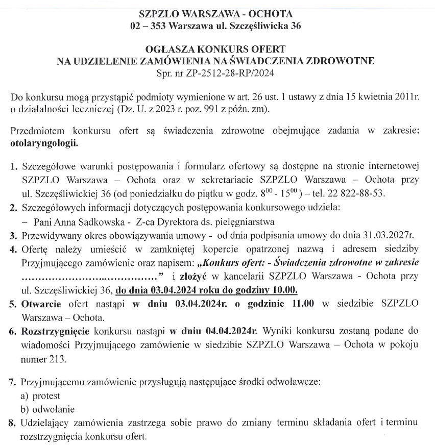 KONKURS OFERT NA UDZIELENIE ZAMÓWIENIA NA ŚWIADCZENIA ZDROWOTNE w zakresie: otolaryngologii (ZP-2512-28-RP/2024)