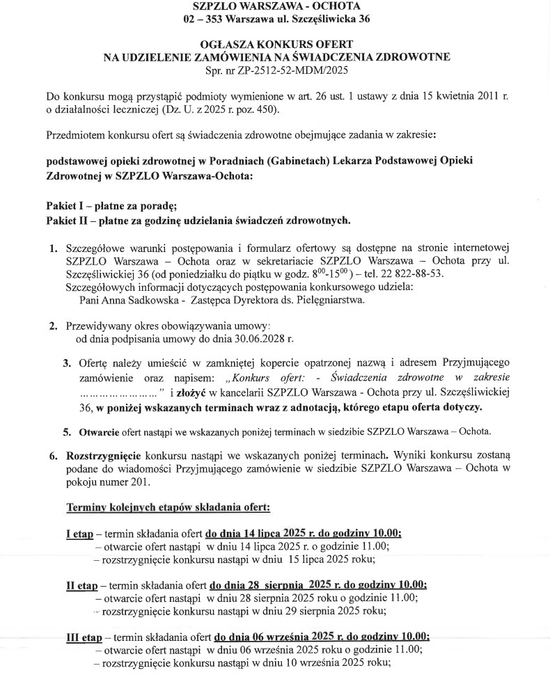 KONKURS OFERT NA UDZIELENIE ZAMÓWIENIA NA ŚWIADCZENIA ZDROWOTNE w zakresie: podstawowej opieki zdrowotnej (ZP-2512-52-MDM/2025)
