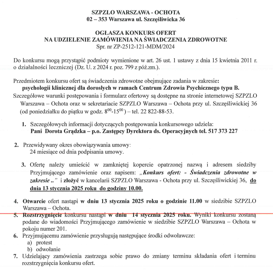 KONKURS OFERT NA UDZIELENIE ZAMÓWIENIA NA ŚWIADCZENIA ZDROWOTNE w zakresie: psychologii klinicznej dla dorosłych w ramach Centrum Zdrowia Psychicznego typu B. Nr ZP-2512-121-MDM/2024
