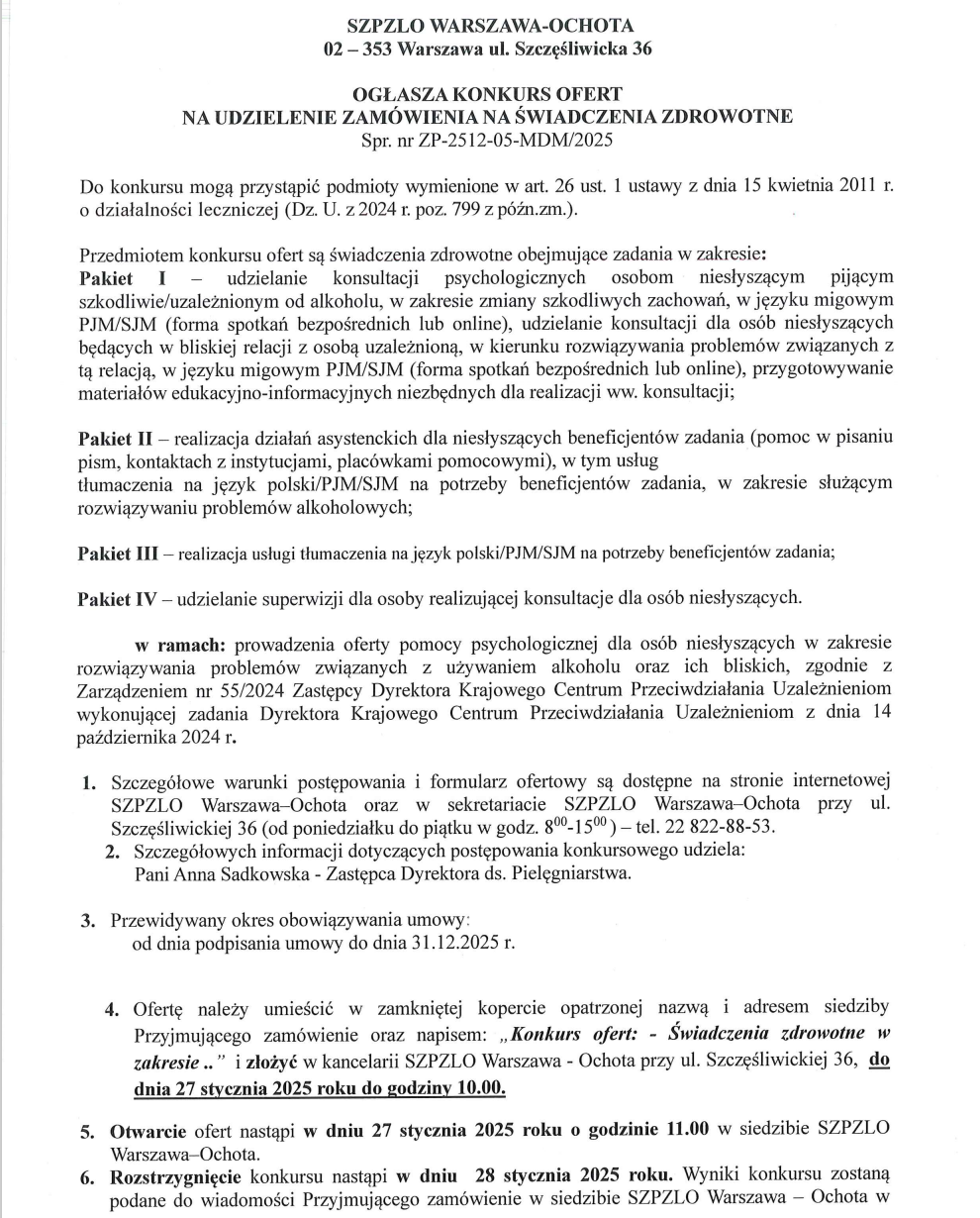 KONKURS OFERT NA UDZIELENIE ZAMÓWIENIA NA ŚWIADCZENIA ZDROWOTNE w zakresie: udzielanie konsultacji psychologicznych osobom niesłyszącym pijącym uzależnionym od alkoholu w języku migowym PJM/SJM