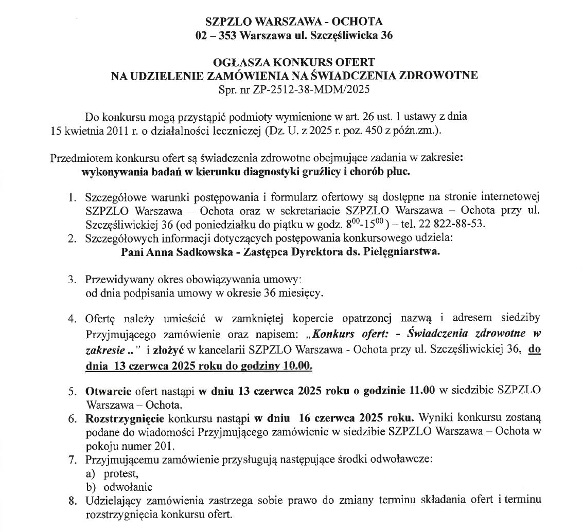KONKURS OFERT NA UDZIELENIE ZAMÓWIENIA NA ŚWIADCZENIA ZDROWOTNE w zakresie: wykonywania badań w kierunku diagnostyki gruźlicy i chorób płuc. Nr ZP-2512-38-MDM/2025