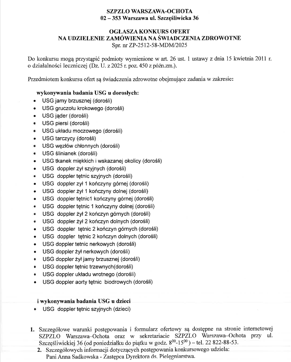 KONKURS OFERT NA UDZIELENIE ZAMÓWIENIA NA ŚWIADCZENIA ZDROWOTNE w zakresie: wykonywania badania USG u dorosłych i u dzieci. Nr ZP-2512-58-MDM/2025
