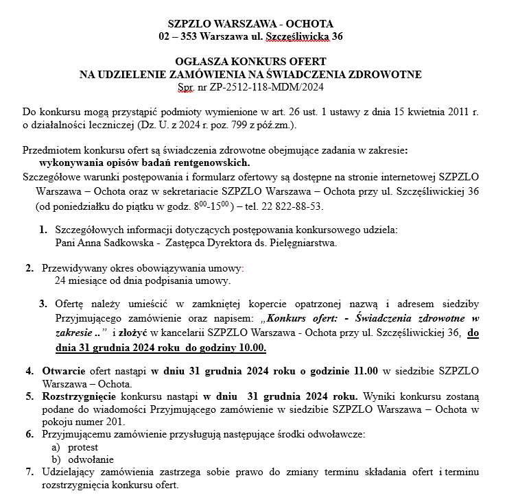 KONKURS OFERT NA UDZIELENIE ZAMÓWIENIA NA ŚWIADCZENIA ZDROWOTNE w zakresie: wykonywania opisów badań rentgenowskich. Nr ZP-2512-118-MDM/2024