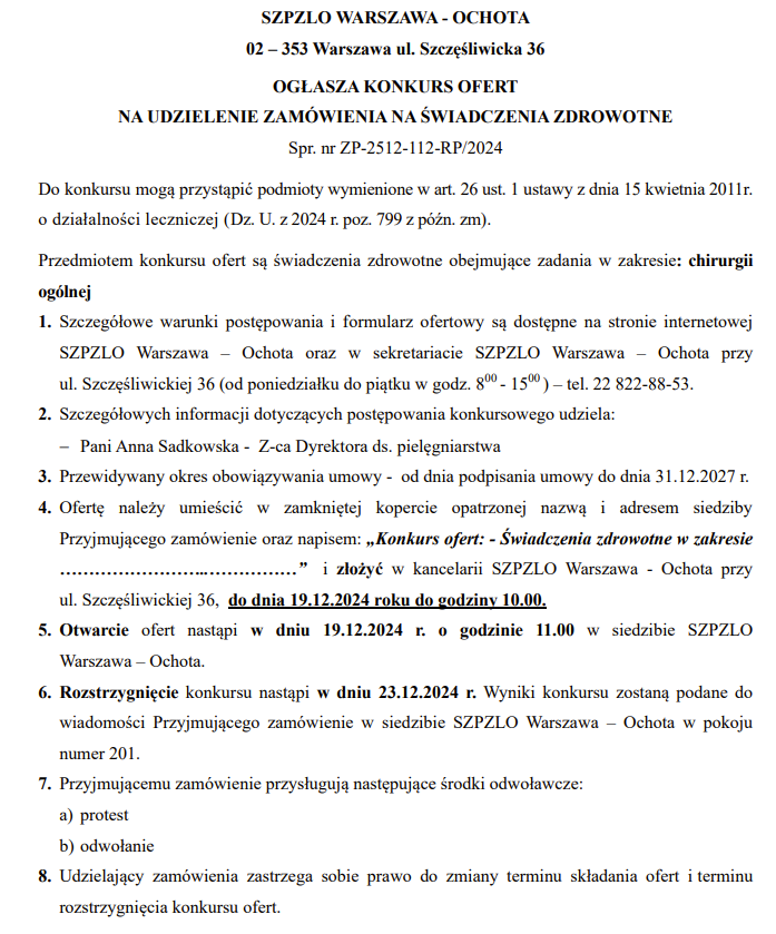 Przedmiotem konkursu ofert są świadczenia zdrowotne obejmujące zadania w zakresie: chirurgii ogólnej nr ZP-2512-112-RP/2024